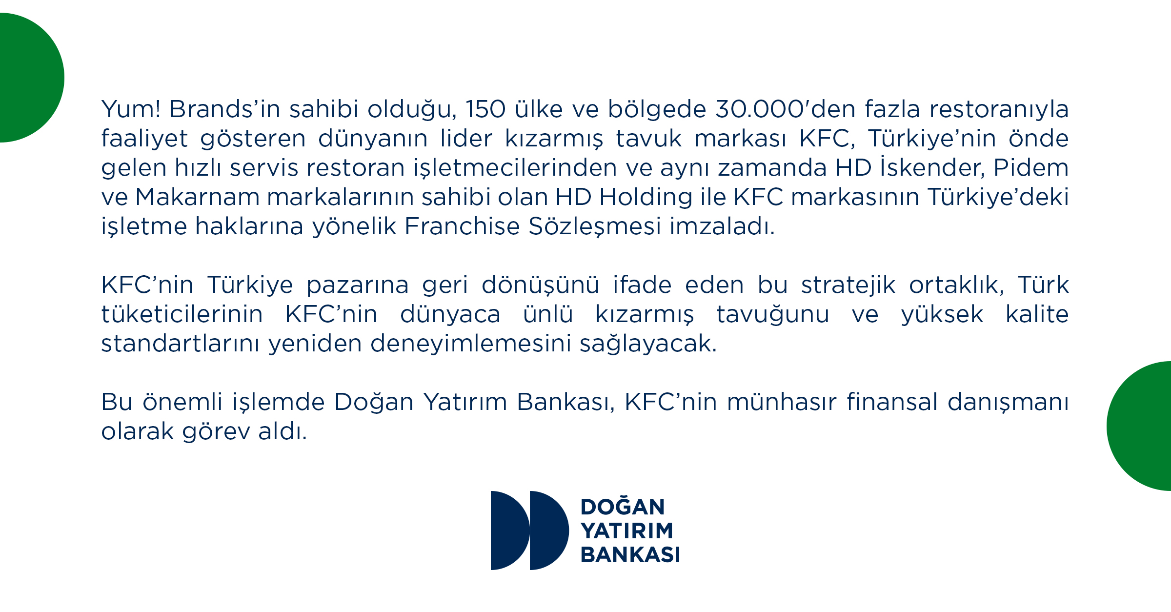 Yum! Brands’in sahibi olduğu, dünyanın lider kızarmış tavuk markası KFC, Türkiye’nin önde gelen hızlı servis restoran işletmecilerinden HD Holding ile Franchise Sözleşmesi imzaladı. Bu önemli işlemde Doğan Yatırım Bankası, KFC’nin münhasır finansal danışmanı olarak görev aldı.