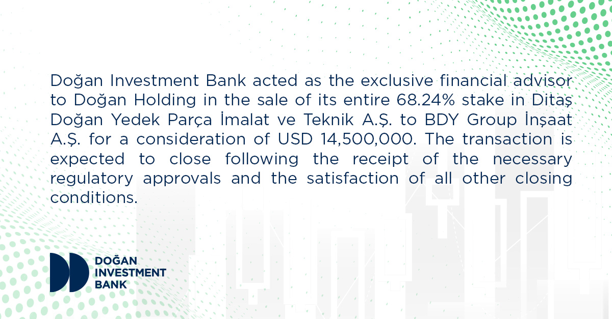 Doğan Investment Bank acted as the exclusive financial advisor to Doğan Holding in the sale of its entire 68.24% stake in Ditaş Doğan Yedek Parça İmalat ve Teknik A.Ş. to BDY Group İnşaat A.Ş. for a consideration of USD 14,500,000