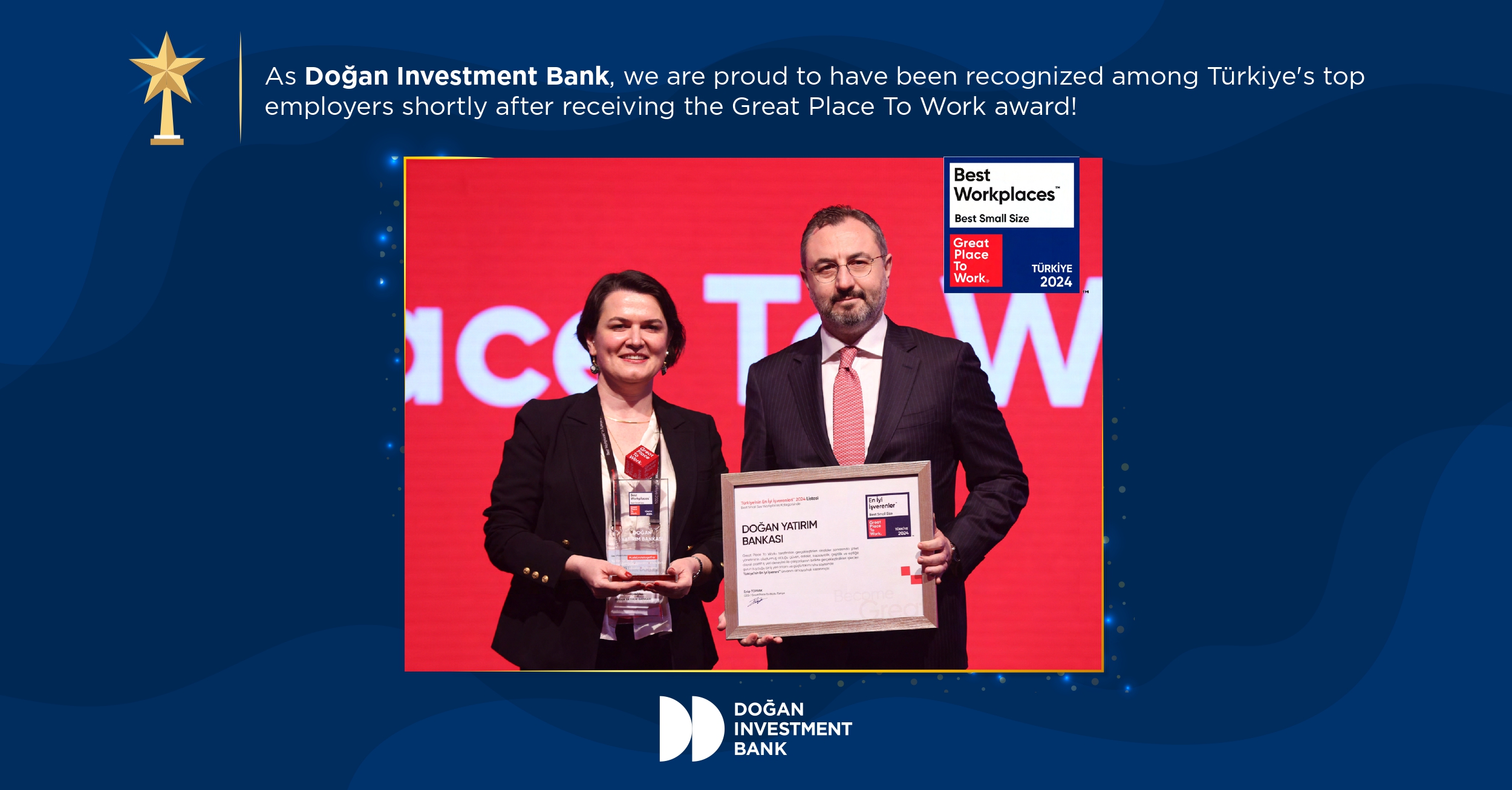 As Doğan Investment Bank, we are proud to have been recognized among Türkiye's top employers shortly after receiving the Great Place To Work award! We are delighted to receive this award only 2.5 years after commencement of our operations and extremely happy for creating a great working environment, thanks to our innovative approach and people-centric culture!