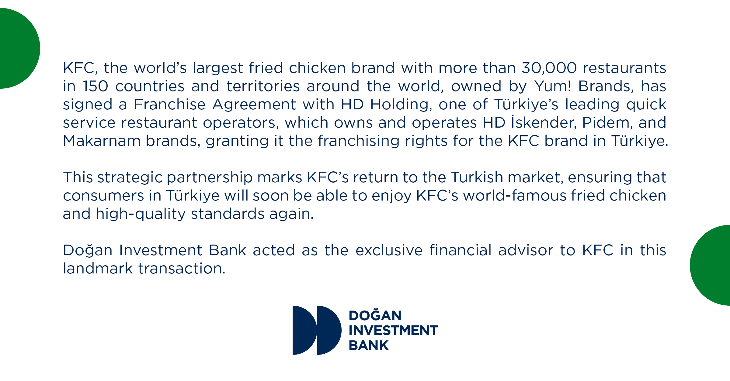 KFC, the world’s largest fried chicken brand, owned by Yum! Brands, has signed a Franchise Agreement with HD Holding, one of Türkiye’s leading quick service restaurant operators. Doğan Investment Bank acted as the exclusive financial advisor to KFC in this landmark transaction.