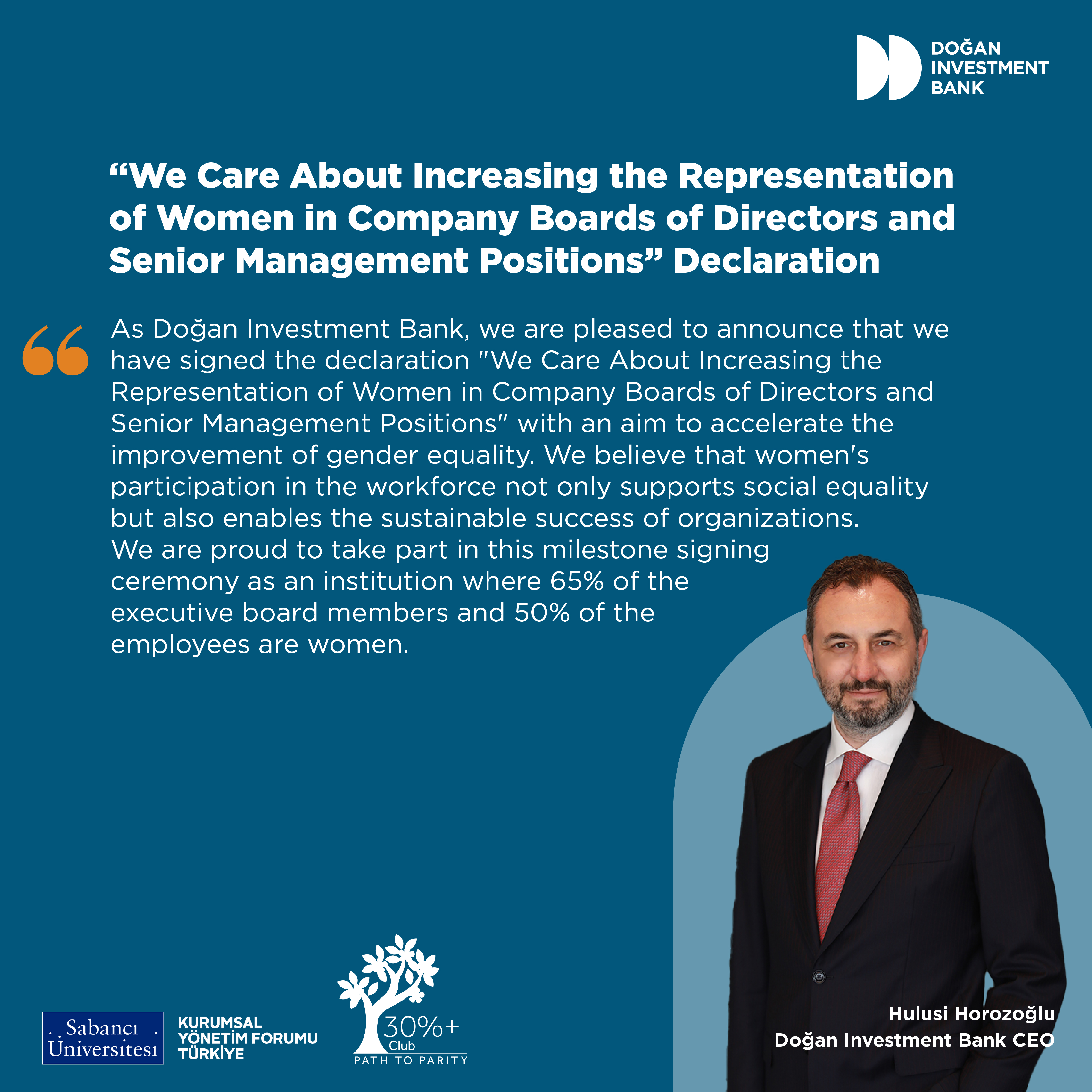 As Dogan Investment Bank, we are pleased to announce that we have signed the declaration "We Care About Increasing the Representation of Women in Company Boards of Directors and Senior Management Positions" with an aim to accelerate the improvement of gender equality.